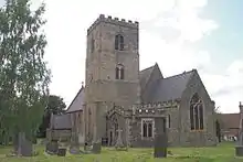 All Saints Church is in the village of Long Whatton, Leicestershire, England. It is an active Anglican parish church in the deanery of Akeley East, the archdeaconry of Loughborough, and the diocese of Leicester.[1] The church is recorded in the National Heritage List for England as a designated Grade II* listed building.[2] It dates mainly from the 14th century, with a tower dating from the late 12th or early 13th century, and its upper stage added in the 15th or 16th century. The church was partly rebuilt in 1865–66.[2] In 1931 the Lancaster architect Henry Paley of Austin and Paley added a baptistry as a memorial to Lord Crawshaw.[3]