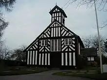 The wooden roofs of the nave and chancel are well preserved,[5] and the nave and chancel are separated by a 14th-century wooden screen.[3] The chancel walls consist of the original timber-framing while the brickwork of the nave is painted to simulate it.[1] All the church fittings are relatively new other than the pulpit which dates from 1633. The gallery at the west end was erected in 1786. The parish registers begin in 1722 and the churchwardens' accounts in 1781. All the church plate was stolen in 1792 and never recovered. A new set was given to the church in 1936 by the Bromley-Davenport family.[5]