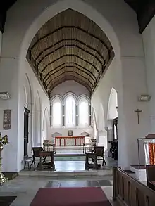 Internally, the nave is separated from the south aisle with a three-bay arcade of 13th-century pointed arches on rectangular piers. The arch to the north nave chapel is similar. The chancel is separated from its chapels with two-bay arcades on each side. The arcade to the south dates from the 13th century but includes a 12th-century column. The north arcade is contemporary with the north chapel. The chancel arch is 13th century on possibly 12th-century bases. The tower arch is 15th century and the arch between the south aisle and the south chapel is 15th century. The roof of the north chancel chapel is early 16th-century with moulded timbers. The other roofs are 19th-century and boarded.[1]