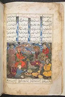 Allahverdi Khan (seated center right) with his son Emamqoli Khan (seated center left). From a Jarunnameh of Qadri. Isfahan style, dated 1697