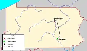The Martin 2-0-2 operating the flight departed Harrisburg with 26 passengers and crew on board and crashed while maneuvering to land at Williamsport Regional Airport in poor weather. A passenger was the sole survivor. Of the 26 passengers and crew many came from Pennsylvania or other Mid-Atlantic states, however there were two foreign nationals on board: one from France and the other from Lithuania.