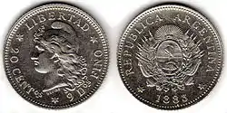 A slightly different version appears on the banknotes of fifty cents m$n, in circulation between 1942 and 1960. This effigy can be compared with the design of Oudiné, and considered inspired by Liberty Leading the People. The Liberty of Oudiné also appears in the logo of the Central Bank of Argentina, and the former company Gas del Estado. It is also used in the seals of the Internal Revenue law present in cigarette packs.