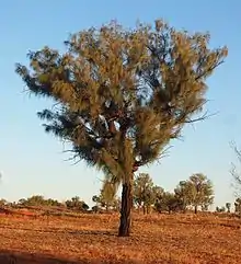 Allocasuarina decaisneana, commonly known as desert oak, desert sheoak,[2][3] or kurkara by the Anangu peoples,[4] is a species of flowering plant in the family Casuarinaceae and is endemic to Central Australia. It is a dioecious tree that typically grows to a height of 10–16 m (33–52 ft) and has long, drooping branchlets, the leaves reduced to scales in whorls of four, the mature fruiting cones 28–95 mm (1.1–3.7 in) long containing winged seeds (samaras) 8.5–17 mm (0.33–0.67 in) long.