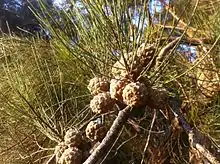 Allocasuarina fraseriana, commonly known as western sheoak,[3] or Fraser's sheoak[4] is a species of flowering plant in the family Casuarinaceae, and is endemic to the south-west of Western Australia. The Noongar peoples know the tree as kondil,[5]condil,[6] kulli or gulli.[7] It is a monoecious tree that has branchlets up to 300 mm (12 in) long, the leaves reduced to scales in whorls of six to eight, and the mature fruiting cones 15–40 mm (0.59–1.57 in) long, containing winged seeds (samaras) 9–10 mm (0.35–0.39 in) long.