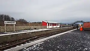 By October 2015, initial plans for the station (including the platforms, footbridge, signal box and locomotive shed) were virtually complete and thus work began on linking the station's track layout with the original trackbed to Alnmouth. The new station was constructed within a field at a higher level than the original trackbed adjacent to it (there being a difference in height of approximately 4 metres between them) and thus it was necessary to partially infill a section of the original railway cutting adjacent to the site to allow trains to descend onto the original alignment at a suitable gradient.[15] The link to the original alignment was completed in time for the first public passenger services to run from Lionheart station onto the original trackbed on 28 December 2017:[16][17] the first time that public passenger service had operated on the original line for almost 50 years. As of August 2018, passenger trains regularly run from the station to Alndyke Farm Crossing, just beyond Bridge 6.[18]