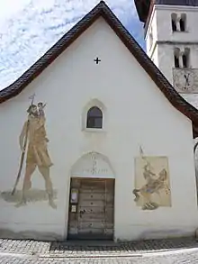 Carigiet murals on the Catholic Church in Vella, Switzerland, depicting Saint Christopher and Saint Maurice (1940)
