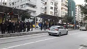 Hocazade Camii is a light-rail station on the Konak Tram of the Tram İzmir system in İzmir, Turkey. It is located on Ali Çetinkaya Boulevard, near the Hocazade Mosque (Turkish: Hocazade Camii), from which the station gets its name.[1] The station consists of two side platforms serving two tracks. Two blocks west of the station is Kıbrıs Şehitleri Avenue, the main street of Alsancak, with many shops, cafes, restaurants and bars.