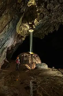 The Alto Ribeira Tourist State Park is divided between the municipalities of Apiaí and Iporanga in the state of São Paulo, lying 320 kilometres (200 mi) away from the city of São Paulo. It has over 350 caves, many waterfalls, trails and archaeological and paleontological sites. There are traditional and quilombola communities in the park.[1] There are four visitor centers and support for enforcement activities and research in order to safeguard and protect the rich natural heritage of the upper Ribeira region, represented by the important biodiversity of the remnants of the Atlantic Forest and its paleontological, archaeological, and historical sites. It is home to one of the most important speleological provinces in Brazil with more than 300 caves registered by the SBE - Sociedade Brasileira de Espeleologia.[2]