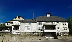 The Alvin O. Lombard House is in downtown Waterville, on the east side of Elm Street just south of the public library, in an increasingly commercial area. It is a rambling 2+12-story wood-frame structure, with a gambrel roof, shingled exterior, and stone foundation. Its front facade, facing west, is dominated by a projecting gabled section, which features a recessed porch flanked by polygonal windows bays, and a three-window recess in the upper part of the gable. A single-story porch extends across the front, and sweeps around to the side without a covering roof. A two-story carriage house of similar styling is attached to the northeastern corner; it has a square cupola at the top of its gambrel roof. The interior retains significant original decorative elements, despite its 1940s alteration into a multiunit residence.[2]