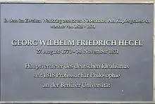 Georg Wilhelm Friedrich Hegel lived from 1819 to 1831 in the war-damaged house Am Kupfergraben 4a. A plaque commemorating Hegel is attached to the neighbouring house, Am Kupfergraben 5. By mistake, the number 5 is often mistaken for Hegel's house. This was the residence of the "Institute for Foreigners" of the Berlin University, which existed until 1945. In the GDR, the Institute for Musicology (Institut für Musikwissenschaft) of the Humboldt University of Berlin moved into the building. After a thorough renovation, the Department of Musicology (Seminar für Musikwissenschaft) has been located in number 5 again since 2003. In the years 1825/1826 the mathematician Niels Henrik Abel also lived in the house Am Kupfergraben 4a, where he spent a research-intensive period. In memory of Abel, a plaque has been attached to the new building which has been erected in the meantime since 2014.[10]