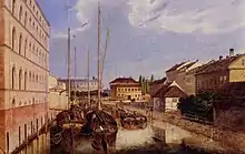 A first development Am Kupfergraben was already carried out around 1580, as a contemporary depiction shows: The Kupfergraben was called Ludwigsgraben for a while after its former owner, the Privy Councillor of State. The artillery barracks, completed in 1773 [No. 1-3], occupy the largest part of the street. Opposite the barracks on the Graben is the royal gunsmith's shop [No. 8]. (Ernst Fidicin)[1]