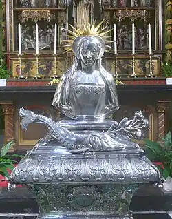 Many miracles, such as crossing the river Scheldt on a giant fish are attributed to her. In heraldry and art this is a sturgeon. Her relics are kept inside the church of Temse.