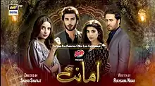 Amanat (meaning trust or fidelity in Urdu) is a 2021 Pakistani television series produced by Samina Humayun Saeed and Sana Shahnawaz under banner of Next Level Entertainment in collaboration with Six Sigma Plus. It features Imran Abbas, Urwa Hocane, Saboor Aly in lead roles and Haroon Shahid, Srha Asghar and Gohar Rasheed in supporting roles. It airs weekly on ARY Digital starting from its premier on 21 September 2021.[1][2][3]