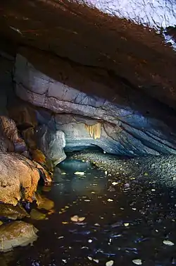 Those passages represent a higher cave level of about 20 m above the lower cave level where the rivers are still active. In some parts of the cave (Sloupsky Corridor, Labyrint of Milan Slechta), even more such cave levels can be found. The lowest part of the system is always under water and its exploration can only be done by using cave diving techniques.