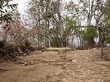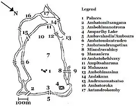 The earliest of the royal compounds at Ambohimanga, Bevato ("many stones", also called Fidasiana-Bevato), was first established by Andriamborona, who built houses there for himself and his family in the late 17th century.[12] It was inhabited by Andriantsimitoviaminiandriana from 1710 to 1730,[29] during which time he expanded the compound on three occasions.[12] The compound was originally surrounded by a low rock wall that was replaced under Andriambelomasina by a wooden palisade. Ranavalona I expanded the compound toward the west by relocating a small house containing the royal idol Rafantaka; further westward expansion was completed under Ranavalona II. Under Ranavalona I and her successors, Besakana served as the residence of the sovereign's relatives during their visits to Ambohimanga. All buildings on the compound were destroyed by the French, who constructed a school on the site (Ecole Officiel), later followed by the Ambohimanga town hall (Tranompokonolona), which was razed after Madagascar regained independence.[12]