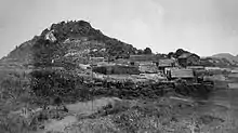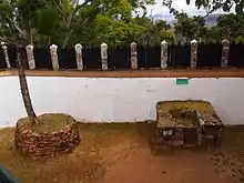 The Nanjakana compound is the most highly elevated of the three compounds in the rova at Ambohimanga. Located to the northeast of Mahandrinoro,[12] this compound is believed to have been first constructed by Andrianjafy in the late eighteenth century.[15] To the north of the compound is a stone esplanade that offers a clear view of the surrounding areas where Andrianampoinimerina reportedly came to reflect on his military strategy for bringing Imerina under his control.[36] During the 1861 funeral of Queen Ranavalona I held in the Nanjakana compound, a spark accidentally ignited a nearby barrel of gunpowder destined for use in the ceremony, causing an explosion and fire that killed a number of bystanders and destroyed three of the compound's historic royal residences.[36]