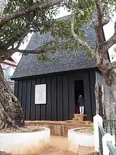 Among the buildings extant at the royal city during the time of King Andrianampoinimerina (1787–1810), only the original Mahandrihono palace remains intact. The Mahandrihono palace, which served as the home of Andrianampoinimerina before he relocated the political capital of Imerina to Antananarivo,[10] has been preserved in its original state since construction, excepting the replacement of the original roof thatch with wooden shingles.[14] The simple wooden structure is constructed in the traditional style of the aristocracy of Imerina: the walls are made of solid rosewood and topped by a peaked roof that is supported by 10-meter central rosewood pillar, much like the one that had originally supported the roof of the Rova Manjakamiadana of Antananarivo before it was destroyed by fire in 1995.[40] The roof horns (tandrotrano) formed at each end of the roof peak by the crossing of the gable beams were originally silver-plated, and a silver eagle was affixed in the middle of the roof peak. Silver ornaments were also hung from the corners of the roof in the interior of the house.[36] The building's name is inscribed on a white marble plaque affixed to an exterior wall near one of the building's two entrances. This house contains a number of items that belonged to Andrianampoinimerina, including weapons, drums, talismans and a bed raised on stilts.[40] During Andrianampoinimerina's time, his wives were allowed to visit this building but not allowed to sleep there overnight.[26] The site is highly sacred: Queen Rasoherina and her successors often sat on the stepping stone at its threshold to address their audience,[12] and many pilgrims come here to connect with the spirits of Andrianampoinimerina and his ancestors. Visitors are asked to enter the house by stepping in with their right foot and exiting backwards, according to custom, in order to show respect for the spirit of Andrianampoinimerina.[40]
