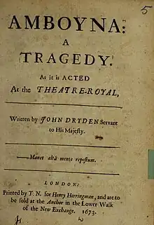 Amboyna, or the Cruelties of the Dutch to the English Merchants is a tragedy by John Dryden written in 1673. Its subject is the Amboyna massacre and the death of Gabriel Towerson that took place on Ambon Island in 1623. Dryden reportedly wrote the play in the short space of a month; he wanted to produce a topical piece, since England was at that time at war with the Dutch Republic.[1] It was dedicated to Lord Clifford, a member of the Cabal.