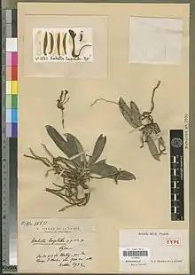 The specific epithet longituba is composed of longi- meaning long[11] and -tuba meaning trumpet.[12] It refers to the long tube-shaped labellum of the flowers.