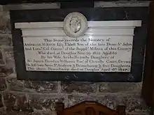 He married Arabella Hamlyn (d. 1805),[1] only daughter of Sir James Hamlyn, 1st Baronet (1735–1811) (born "James Hammet") of Clovelly Court in Devon, and of Edwinsford, Carmarthenshire, Wales, a Member of Parliament for Carmarthen 1793–1802 and Sheriff of Devon 1767–8. Her mother was Arabella Williams (died 1797), daughter and eventual heiress of Thomas Williams (died 1792) of Edwinsford, Llandeilo, and of Court Derllys, both in Carmarthenshire. By Arabella he had issue two sons and five daughters,[1] including: