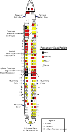 Seating chart for American Airlines Flight 1420 created by the NTSB, revealing the location of passengers and lack of injury, severity of injuries, and deaths.