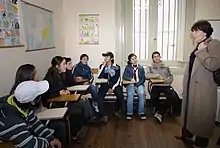 American Corners are areas within existing libraries or other institutions to provide information to the target populace located far from U.S. embassies.[68] At a start-up cost of US$35,000 the local U.S. embassy furnishes a space in a local library with several hundred books as well as six computers with internet access.[18] While the U.S. government provides the books and other materials, they are not staffed by Americans.[62] The concept proliferated across Eastern Europe and Central Asia in the early 21st century. In 2008, American Corners across Belarus (Babrujsk, Brest, Homel, Hrodna, Mahilyou, Malazhechna, Minsk, Pinsk, Polatsk and Vitsebsk) were closed without explanation.[69] As of February 2009, there were 414 such corners in existence.[18] A 2017 doctoral thesis posited a utilization analysis showing a cost-savings in American Corners, paired with a native institution and more-accessible to the general public than the spaces within heavily fortified embassies, indicating the former as more economical than the latter.[70] In 2002, then–Under Secretary of State for Public Diplomacy and Public Affairs Charlotte Beers proposed, in cooperation with the Smithsonian Institution, a program of "American Rooms" located within universities and other venues in the Middle East aimed at young adults to virtually display true American life as opposed to the fiction found on TV shows and movies.[71][72] In December 2016, one such room was opened at the University of Sarajevo providing students there an opportunity to observe U.S. public corruption trials.[73]