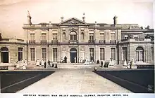 The relief fund also provided partial funding for a field hospital in Belgium run by the wife of an officer, Mrs. O'Gorman.[19] Another hospital, known as the American Women's Hospital, was located at Lancaster Gate and had been opened in 1917 by Walter Hines Page and Willa Alice Wilson Page.[3][5] The Lancaster hospital had 41 beds and was mainly staffed with American nurses.[5] It was inspected by King George and the Queen in 1917.[20] It closed in 1919.[7]
