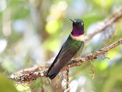The amethyst-throated sunangel (Heliangelus amethysticollis) is a species of hummingbird in the "coquettes", tribe Lesbiini of subfamily Lesbiinae. It is found in Bolivia, Ecuador, and Peru.[3][4]