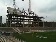 The planned renovation quickly expanded into a rebuild of the entire stadium above ground level, and partially below. Only the below-ground-level playing field and lower seating bowl were retained. Everything else, including much of the subterranean infrastructure, was rebuilt. The West-side stands were imploded on December 5, 2010, and the East-side stands were demolished during the early winter 2011. The stadium reconstruction was funded completely by donor support (no bonds or debt). The project was fully completed in 2012 at a total cost of $164 million.