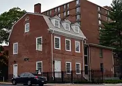 The Amos Bull House stands just south of the Pulaski Mall, south of Downtown Hartford, on the west side of South Prospect Street. This is not the house's original location, which was a short way west on Main Street; it has been moved twice. It is a 2+1⁄2-story brick building with a gambrel roof. It is three bays wide, with the main entrance in the leftmost bay. Openings on the front facade are rectangular, and topped by splayed brownstone lintels. The front cornice is adorned with dentil moulding, a detail repeated in gabled dormers projecting from the roof. On the exposed side elevation there is a small sash window in a peaked-gable opening in the gable area, with a smaller half-round window above it just below the roof ridge. The interior only retains a few traces of its 18th-century origin.[2]