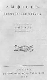 Amphion (Russian: Амфион, pre-1917: Амфiонъ) was a Russian monthly literary magazine published in Moscow in 1815. Prose was but a small part of its genda; what prevailed there were odes, fables in verse, elegies and translations of classics like Horace, Titus Livius and Lucian. It was the first Russian magazine where serious critical analysis of poetry, prose, drama and theatre productions started to feature on regular basis.[1] The central figure in Amphion was its editor-in-chief and co-publisher (alongside with S.Smirnov and Fyodor Ivanov), the poet and literary critic Alexey Merzlyakov (who also went down in history as the young Mikhail Lermontov's personal tutor). His in-depth analysis of Kheraskov's Rossiyada (serialized in Nos. 1–3, 5–6, 8—9), which is considered to be the first work of literary criticism in Russia, had a strong formative influence on Russian literary scene of the time.[1]