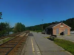 Amsterdam station has a small unstaffed brick station building, with one low-level side platform on the north side of the two tracks.