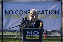On September 19, 2020, President Trump told supporters at a rally in Fayetteville, North Carolina, "I will be putting forth a nominee next week – it will be a woman".[16][17] By September 21, Trump said that his list had been narrowed to just five names, with a final nomination to be made on September 24 or 25.[18] As of September 2020, President Trump's complete list of Supreme Court candidates contained 44 names, of whom 12 were women. September 22 news reports identified Barrett, Barbara Lagoa, Joan Larsen, Allison Jones Rushing, and Kate Comerford Todd as the top contenders, with Barrett the frontrunner.[19][20]