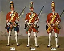 A painting by Morier made c.1751, illustrating the uniforms of grenadiers from different regiments. A soldier from The King's Own regiment is on the left.