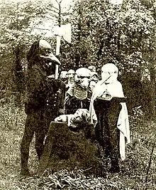 An Old-Time Nightmare is a lost 1911 American silent comedy-fantasy film. Directed by Fred Walton, the short was released as the latter half of a 1000-foot "split reel", with the first half being another comedy short, Lost in a Hotel.[5][1] Both films were produced by the Powers Moving Picture Company of New York. This short's performers are not credited in 1911 reviews, in plot summaries, or in advertisements published in trade journals at the time. The faces of most of the cast were not visible on screen, for many of the actors wore costumes with full head coverings sculpted to resemble various species of birds, including a sparrow, eagle, dove, owl, wren, stork, bluebird, robin, linnet, and crow. While the short was identified upon its release as a comedy, it was also characterized in several contemporary reviews as a morality lesson and ideal photoplay for "juvenile" audiences.[6]