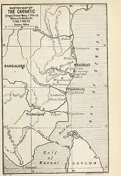 Pillai also expressed strong disapproval of some of the allegedly corrupt measures of Governor Dupleix's wife Madame Dupleix.[61][63] The bitterness led to open hostilities between them. Pillai was given the charge of collecting the revenue of a few villages in Karaikal and he performed his duties satisfactorily despite the prevalence of inconsistencies and unreliability of the records kept by his subordinate agents.[55]