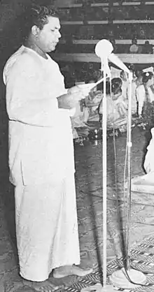 Ananda Wahihana Palliya Guruge, General Secretary of the Lankā Bauddha Mandalaya reads a message from the Prime Minister of Ceylon S. W. R. D. Bandaranaike at the Buddhist Council (Chaṭṭa Sangāyanā) in Rangoon, 1956-04-23.