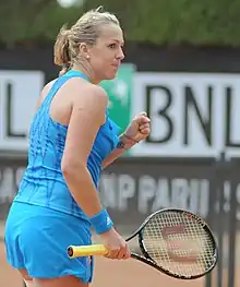Pavlyuchenkova began the clay-court season at the Porsche Tennis Grand Prix where she lost to second seed Vera Zvonareva in the round of 16. She then defeated Zheng Jie, Marion Bartoli and Samantha Stosur to reach the quarterfinals of the Madrid Open where she lost to Julia Görges.[23] The following week in Rome, Pavlyuchenkova advanced to the round of 16 where she lost to third seed Victoria Azarenka, in three sets. Pavlyuchenkova was the 14th seed at the French Open and advanced to her first ever Grand Slam quarterfinal after racking in wins over Yaroslava Shvedova, qualifiers Mona Barthel and Nuria Llagostera Vives and third seed Zvonareva.[24] There, she came up short to defending champion Francesca Schiavone in three sets despite having been two games away from upsetting the Italian.[25][26]