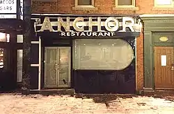 The Anchor is a popular bar and restaurant located at 272 College Street in downtown New Haven that operated from the 1930s until 2015, reopening in 2016. The establishment is popular with students and faculty of neighboring Yale University and patrons of the Shubert Theatre. It was a favorite of playwright Thornton Wilder and also catered to such celebrities as Lucille Ball, Douglas Fairbanks, Jr., and George C. Scott. It is known for its preserved Art Moderne facade and interior.[1] In 2014 Esquire magazine ranked the Anchor among the nation's top 25 bars. [2]
