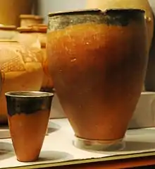 Pots fired in a firing pit often have a black upper rim. These black rims were increasingly a decorative feature, which required technical knowledge to produce consistently. In combination with a dark-red colour and polish, this black-topped ware was one of the most fashionable and popular types of pottery. The black colour was a result of carbonisation, created by the introduction of smoke particles to the oven during the firing process for example. Some aspects of this special process are still unclear.[35]