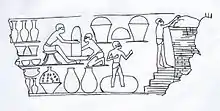 According to Dorothea Arnold, the slow potter's wheel was invented some time during the Fourth Dynasty.[22] Eva Christiana Köhler has subsequently argued that this should be corrected to a substantially earlier period, "the invention of the potter's wheel is a development which generally accompanied a certain form of mass-production. It enabled standardisation and the rapid production of finished vessels."[21] According to her, this development can clearly be traced back to the mass-produced conical bowls of the Mesopotamian Uruk culture at Habuba Kabira.[23]