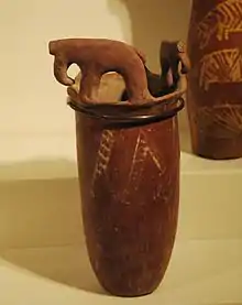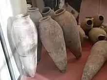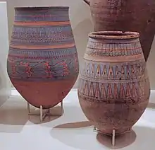 Ancient Egyptian pottery includes all objects of fired clay from ancient Egypt.[1] First and foremost, ceramics served as household wares for the storage, preparation, transport, and consumption of food, drink, and raw materials. Such items include beer and wine mugs and water jugs, but also bread moulds, fire pits, lamps, and stands for holding round vessels, which were all commonly used in the Egyptian household. Other types of pottery served ritual purposes. Ceramics are often found as grave goods.