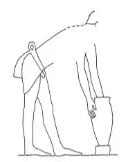After the clay had been mixed with water it would be full of air bubbles. To prevent cracking during the firing process, the clay had to be kneaded. In this process, two halves of a lump of clay were beaten against one another with significant force. In the tomb paintings, a worker in a bent position is shown working the clay with his hands before handing the kneaded balls directly over to the potter.[15]