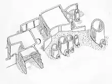 The next technological advance was the introduction of a grating, which separated the fuel from the pottery being fired. This prevented smoky flames and carbonised fuel from coming in contact with the ceramics and leaving flecks and smudges on it.[30] The vessels being fired were placed in the upper part, with the opening underneath. The hot air rose up to the vessels and circulated around them, indirectly firing the clay.[31] Shaft ovens of this type, with a grating, are attested in Egyptian art and by archaeology from the Old Kingdom onwards.