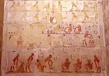 There is little precise information on how and where Egyptian potters got their raw material, how clay pits were run, how it was transported and how it was assigned to individual potters.[8] In general, it seems that the clay came from three different places: the shore of the Nile or irrigation canals, the desert near the fields, and the hills of the desert itself. A depiction in the tomb of Rekhmire (TT100) shows workers in the process of building up pile of Nile mud with hoes in order to make mudbricks. Clay for pottery production might have been gathered in a similar way. The scene also shows that Nile clay did not absolutely have to be taken from the fields. Piles of Nile clay were built up in the process of digging irrigation canals - as still happens today.[9]