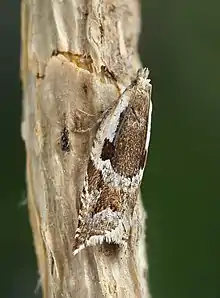 The wingspan is 12–16 mm.[3] The forewings are ochreous or pale brownish, sometimes striated with whitish. The costa is posteriorly spotted with dark fuscous and there is a rather dark fuscous irregularly triangular dorsal blotch extending from base to beyond middle, the surrounding space sometimes wholly whitish. The central fascia is ochreous-brownish, with a wedge-shaped posterior projection upwards from below middle, marked with one or two black dashes in middle. The hindwings are grey.[4] Julius von Kennel provides a full description.[5]