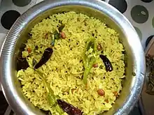 A complete vegetarian Andhra meal typically consists of rice served with ghee, pulihora, chapati or puri, pappu (lentils), sambar, chaaru (rasam), fried and wet curries, appadam (papadum), odiyalu, chutney, pachadi, avakaya, yoghurt and a sweet for dessert. In general, food from the Vijayawada-Guntur region contains more chili and spices than food from the rest of Andhra Pradesh. Rice is considered the main dish and everything else is considered a side.