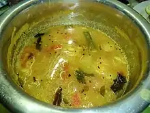 Pulusu (meaning sour) is a curry-like stew that is typically sour and cooked with tamarind paste. Other common bases include tomatoes or mangoes. The mixture can be flavored with mustard, chilis, curry leaves, jaggery, onions, or fenugreek. Fish, chicken, and eggs are typical meat additions. Pachi pulusu is an unheated version of pulusu, typically made of mangoes or tamarind, and eaten during the warmer months.