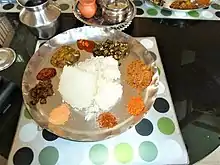 Rice is the main dish, eaten by mixing with the side dishes using the right hand, and the primary source of carbohydrates. Spiced pickles, pachadi, podi, and papadum (appadam) are typical side dishes.