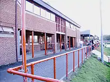 In 1989 the club moved to the Portway Stadium, situated in the Portway Industrial Estate on the western outskirts of the town.[5] Built at a cost of £850,000,[36] the ground has a main stand of brick and concrete construction with bench seating for around 250 people.[37] This stand is set on a bank running along the entire south side of the ground, giving spectators on that side an elevated view of the pitch.[37] The managers' benches are set into this banking in front of the stand at pitch level. The banking slopes down behind each goal until it reaches the same level as the pitch along the north side. There is hard standing around the entire perimeter of pitch, along with a turnstile block and a gate opening out onto the stadium car park for ambulance access.